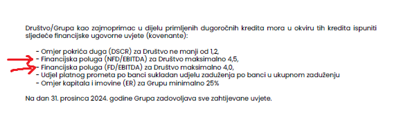 ▶️Jedna omogućava klijentu da se zaduži do razine omjera NETO duga i EBITDA-e od 4,5x, a druga do razine BRUTO duga i EBITDA-e od 4,0x.