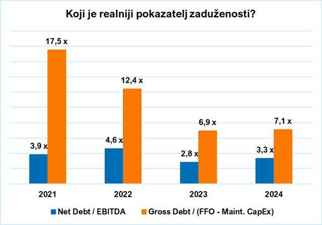 9. rujna 2025.Na slici imate prikaz dva pokazatelja zaduženosti jedne domaće srednje velike kompanije – jedan je uobičajeni Net Debt / EBITDA koji koriste mnogi, a drugi se temelji na jednoj razini cash flowa i još u obzir uzima Gross Debt (bruto financijski dug). I valjda sam jedini koji ga koristi u radu. 😊